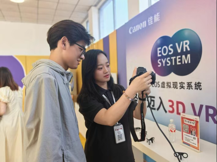 為進一步讓學生感受專業攝影設備的魅力,活動現場特別設置了佳能器材體驗區。在焦作市眾邦攝影公司的大力支持下,佳能品牌方攜多款旗艦相機、專業鏡頭及創新設備現場展示,包括輕便靈活的微單相機、高性能單反相機、最新發布的影像機型、以及具備沉浸式效果的魚眼鏡頭與VR拍攝設備,為同學們打開了通向未來影像技術的大門。