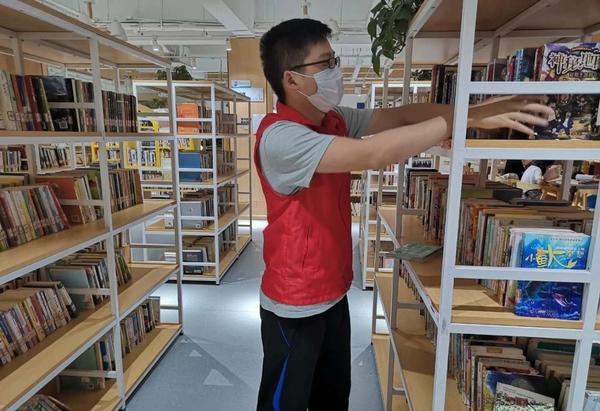實踐隊員徐曉龍每天到張洼新村悅書房開展整理書籍、打掃衛生、場地消毒等工作。據徐曉龍介紹,暑假來這里借書的小朋友很多,每次借閱或者還書,他都要根據書的編號逐一歸位,當發現有破損書籍時,需要拿給工作人員進行修補。有讀者不會使用借書機器時他給予幫助。雖然疫情防控已進入常態化,但由于書房讀者較多,他每天依然對書房進行三次消毒,讓讀者們放心閱讀。