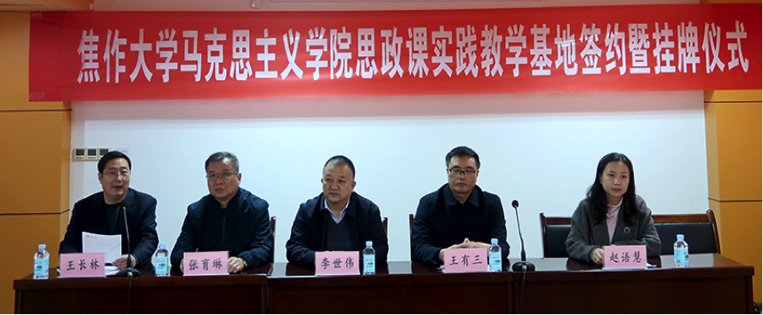 11月13日,焦作大學法律與政治學院(馬克思主義學院)思政課實踐教學基地掛牌儀式在西滑封精神干部培訓中心舉行。西滑封村黨委委員、西滑封精神干部培訓中心主任王有三、焦作大學法政學院黨總支書記張育琳、院長李世偉、副院長趙語慧及師生代表30余人參加掛牌儀式,儀式由焦作大學法政學院辦公室主任王長林主持。
