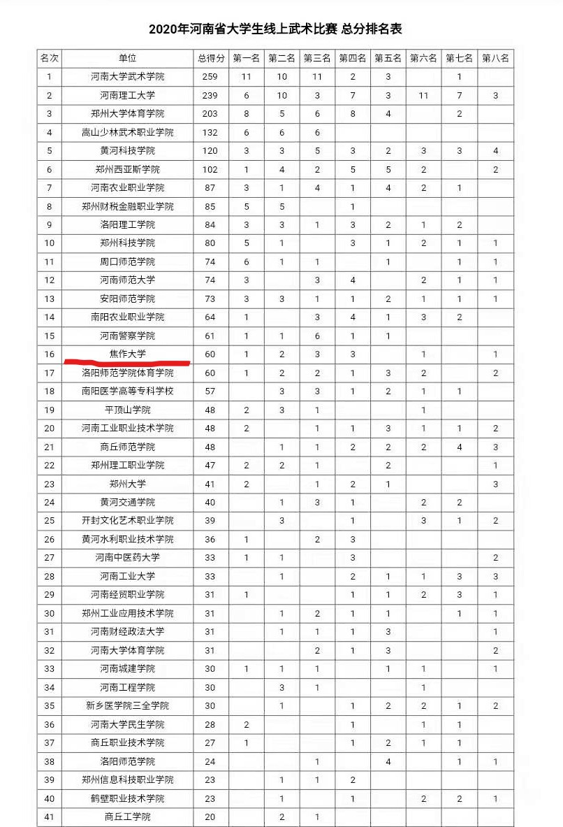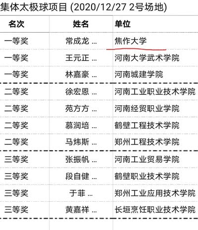 2021年1月4日,記者從焦作大學(xué)獲悉,該校太極武術(shù)學(xué)院在“2020年河南省大學(xué)生線上武術(shù)比賽”中獲得佳績(jī),該校男子、女子代表隊(duì)分別獲得乙組團(tuán)體總分第2名、第3名,太極球集體項(xiàng)目獲得一等獎(jiǎng)。