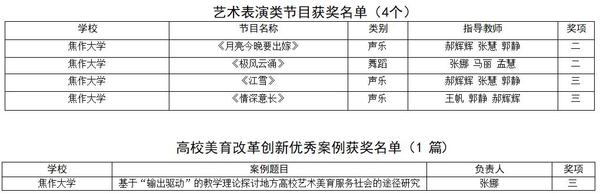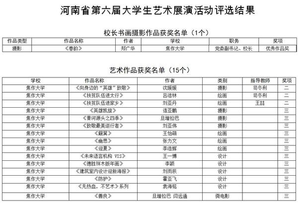 據(jù)了解, 河南省大學(xué)生藝術(shù)展演活動(dòng)每三年舉辦一屆,是河南省目前規(guī)模最大、影響最廣的藝術(shù)盛會(huì)。本屆活動(dòng)以“奮斗﹒創(chuàng)新﹒奉獻(xiàn)”的主題,比賽從2019年11月到2020年11月,歷時(shí)一年。焦作大學(xué)黨委高度重視、校團(tuán)委積極組織,在藝術(shù)學(xué)院的通力協(xié)作與配合下,在作品指導(dǎo)教師的辛勤創(chuàng)作和耐心指導(dǎo)下,參賽學(xué)生克服困難、精心創(chuàng)作,喜獲佳績(jī)。