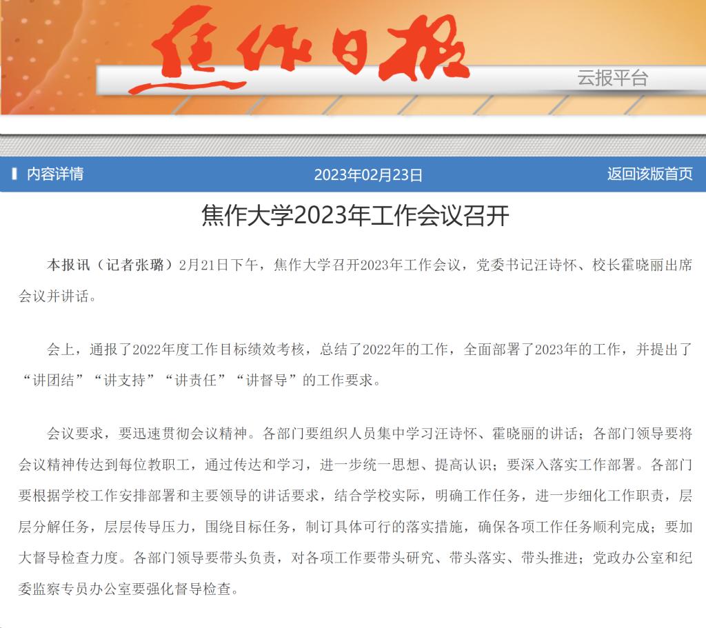 近日,《焦作日報》對我校2023年工作會議情況進行報道。