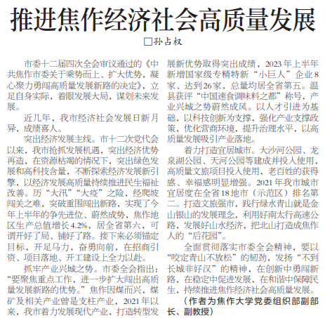 近日,《焦作日報》刊登我校教師孫占權的研究報告《推進焦作經濟社會高質量發展》。