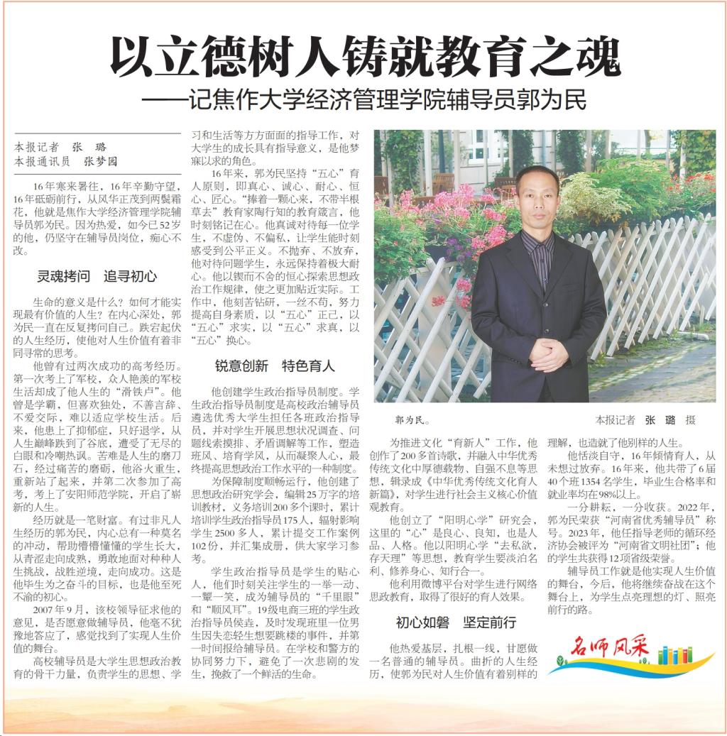 近日,焦作日報對我校經濟管理學院輔導員郭為民先進事跡進行報道。