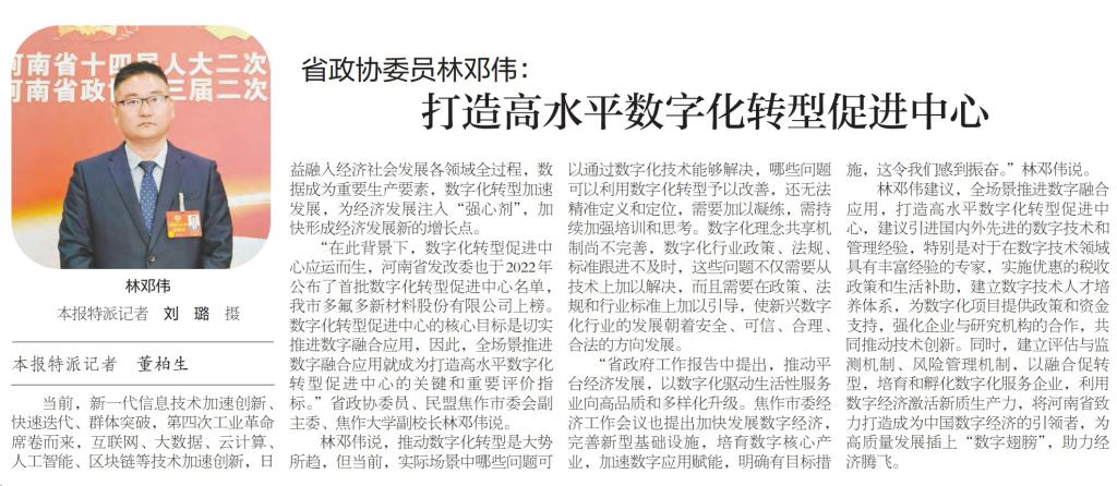 近日,《焦作日?qǐng)?bào)》對(duì)省政協(xié)委員、民盟焦作市委會(huì)副主委、我校副校長(zhǎng)林鄧偉在省兩會(huì)上建言獻(xiàn)策情況進(jìn)行報(bào)道。