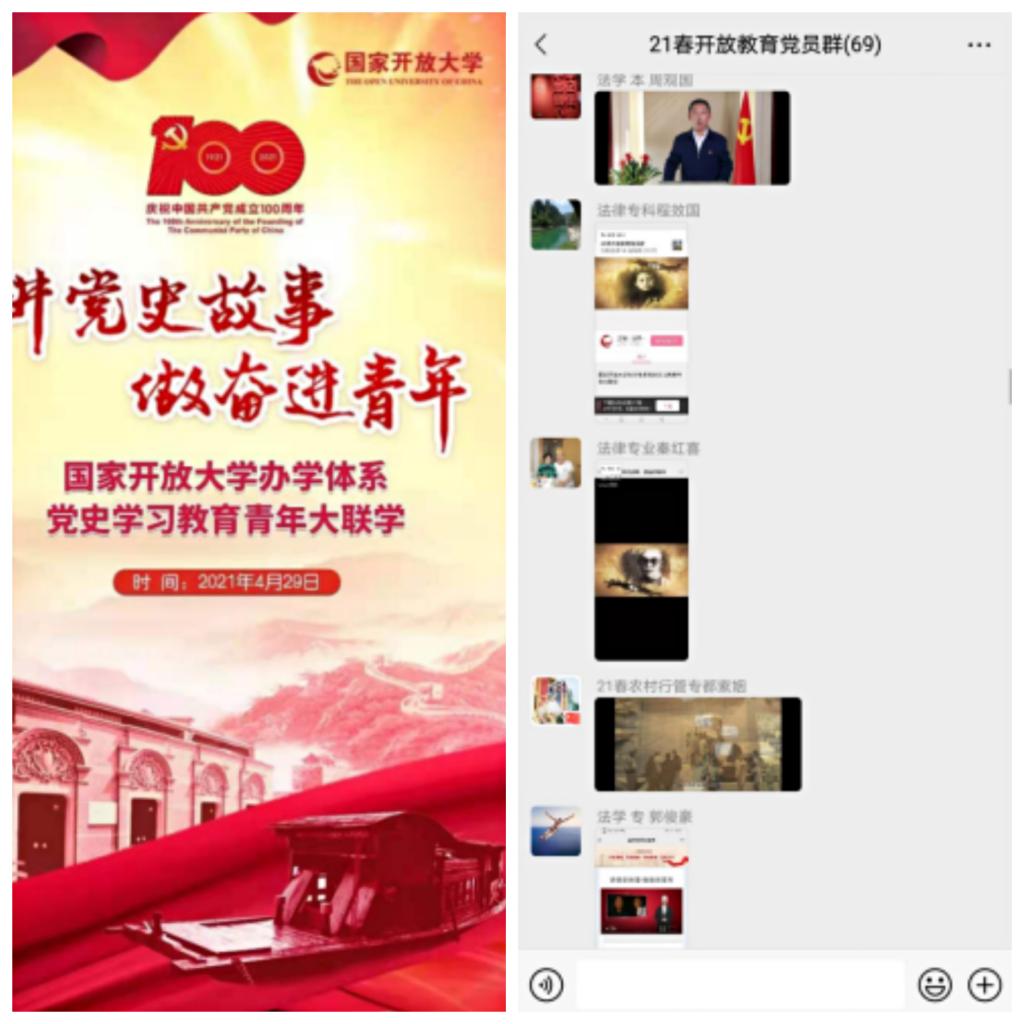 今年,我院創(chuàng)建了“21春開放教育黨員群”,由學(xué)院2021級春季63名學(xué)生黨員和學(xué)工支部、學(xué)生管理科的老師組建而成,固定每周三向群內(nèi)推送黨史學(xué)習(xí)教育相關(guān)內(nèi)容,至今已推送九篇,在黨員群中形成了良好的“學(xué)習(xí)黨史,黨員率先”的大學(xué)習(xí)、大討論、大實踐,和“奮進新國開、建功新時代”的學(xué)習(xí)氛圍。