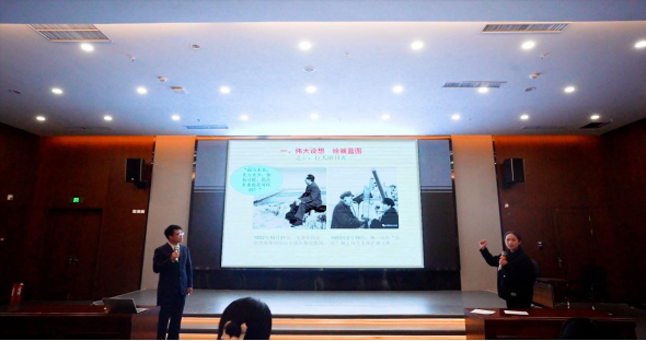 活動中,學生們首先參觀了方志館基本陳列廳和故鄉之水、和諧征遷、復興之水專題展廳。隨后,在方志館二樓報告廳,馬克思主義學院思想道德與法治教研室主任李國防與方志館講解員王芃共同為學生進行雙主講實踐教學,將理論教育生動嵌入在鮮活的社會實踐之中。讓學生們了解了古今中外的調水歷史、國家南水北調設計初衷、歷史沿革、施工路線、技術支撐、工程征遷、建設進程等情況,深刻感受到南水北調工程重大的社會意義和歷史意義,以及庫區移民和沿線征遷區人民在國家利益、人民利益面前舍小家為大家、顧全大局的奉獻精神,黨員干部在艱難險阻面前忠誠擔當、攻堅克難、艱苦奮斗、創新求精的工作精神,更加全面理解“忠誠擔當、頑強拼搏、團結協作、無私奉獻”的南水北調精神。