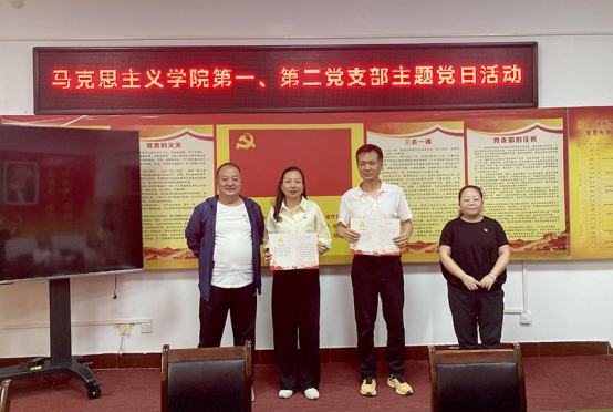 在學院黨員活動室,全體黨員和思政課教師學習了《習近平新時代中國特色社會主義思想專題摘編》第十一章“以自我革命精神推進全面從嚴治黨”,和《中國共產黨紀律處分條例》部分章節內容。全體黨員面對黨旗,重溫入黨誓詞。第一、第二黨支部分別為趙語慧和孫聚團兩名同志過政治生日,并為他們贈送了政治生日賀卡。全體黨員繳納了當月黨費。